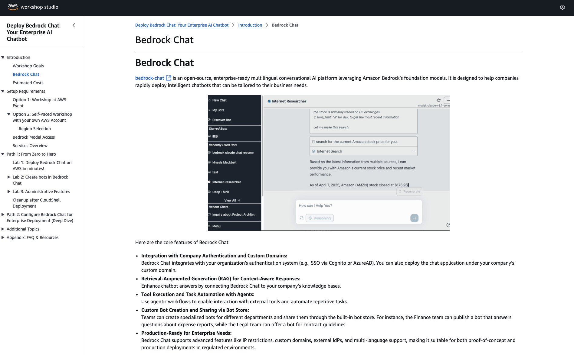 The official AWS workshop provides comprehensive, hands-on training for Bedrock Chat. Learn how to deploy, configure, and use all features through guided exercises.